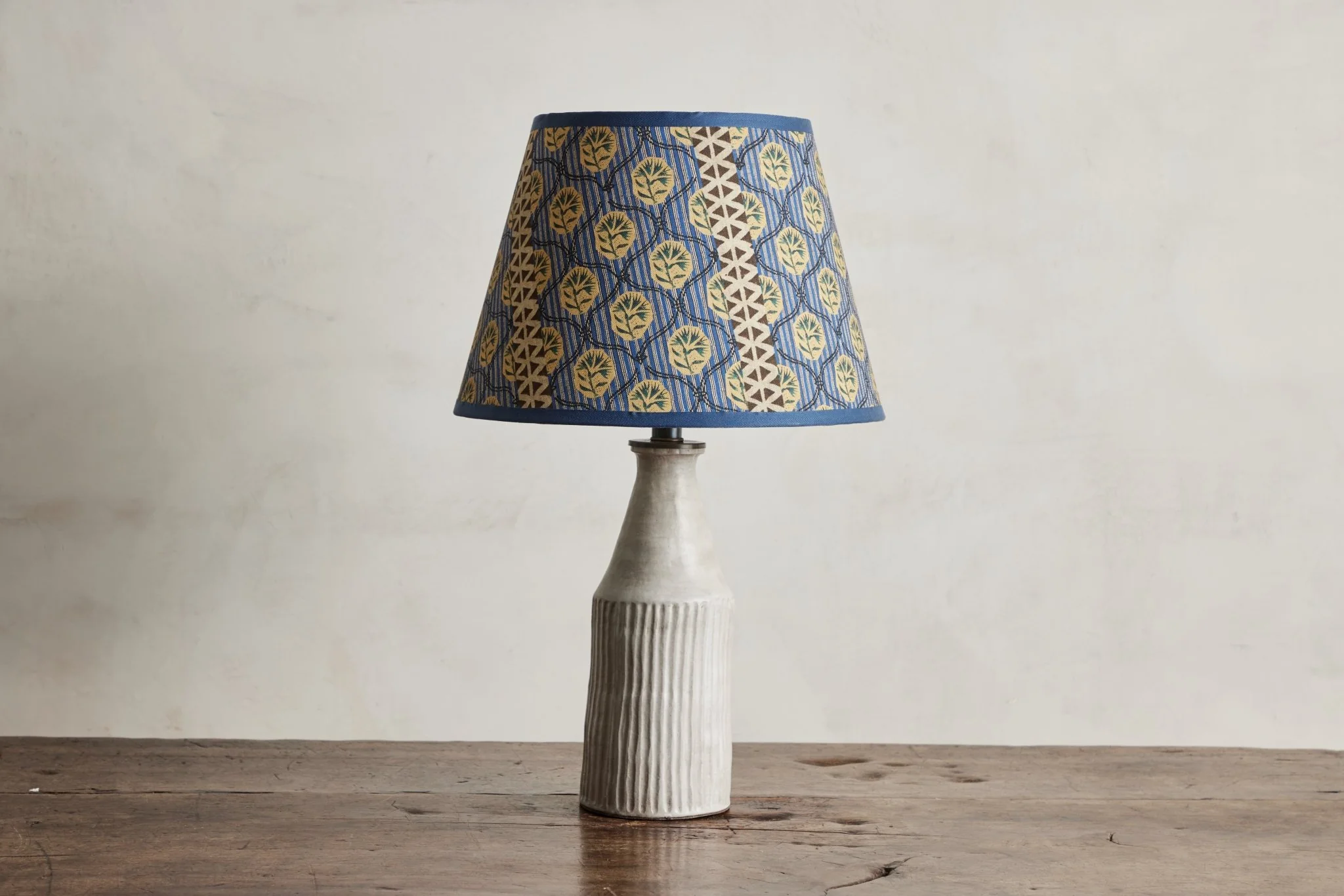 Linen and cotton fabric lampshade by Alix Soubiran in “Audrey Blue” from the Ma France fabric collection. Spider w/washer style lampshade (12” top dia. x 17” bottom dia. x 12 ½” H)