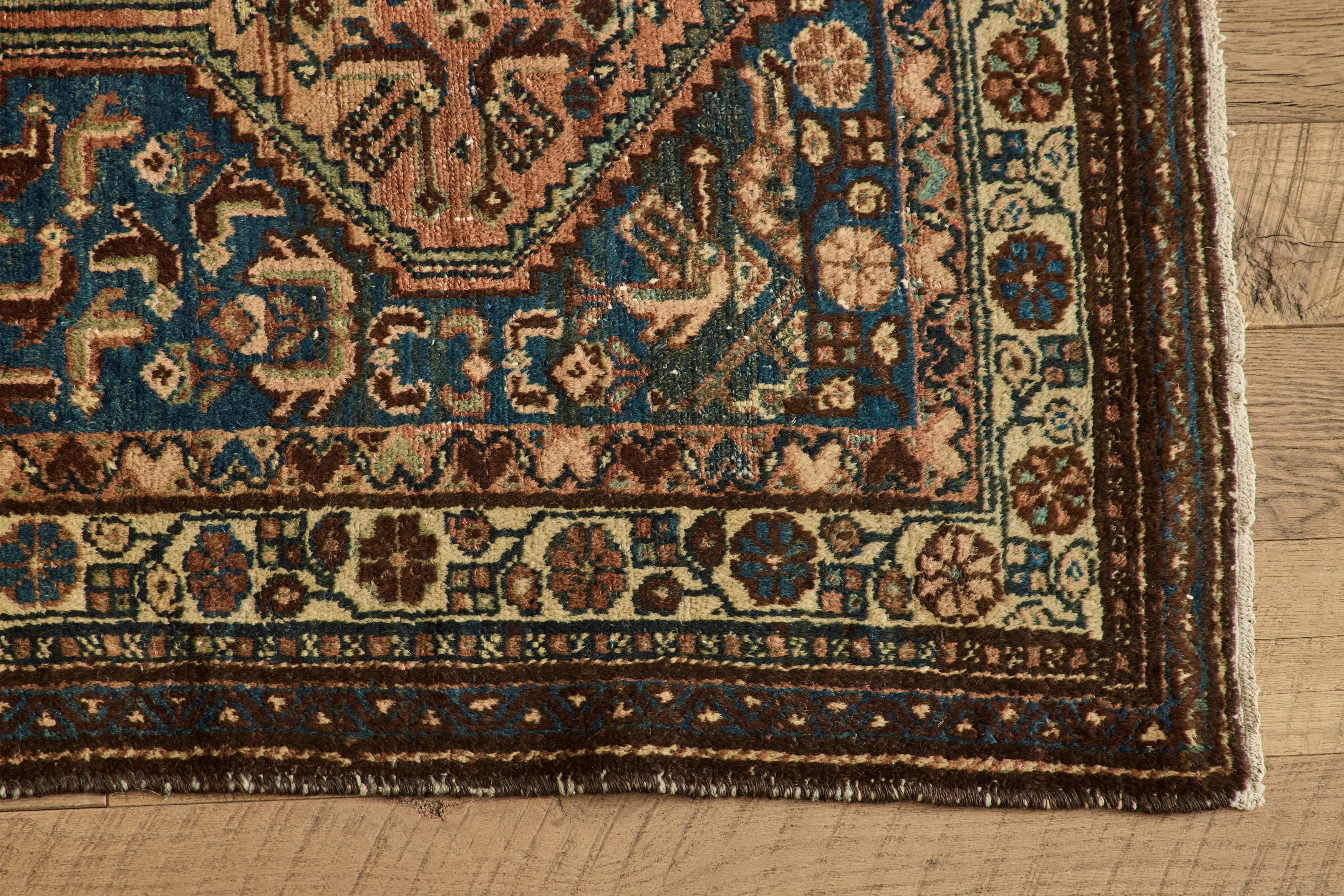 Antique Persian Kurdish from the 1920s in great condition. Deep indigo field with paired diamond medallions and fish motifs surrounding. A calm story of camel and terracotta with a tribal and crisp village drawing. Handwoven with vegetable dyed wool. In nice condition with a low, but lustrous pile.